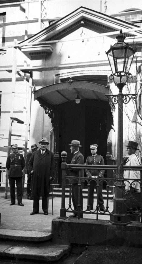 Latvijas Valsts un Ministru prezidents Kārlis Ulmanis iepazīstas ar Rīgas pils pārbūves darbiem. 2. rindā no kreisās: 1. Rīgas pils komandants (1936-1940), pulkvedis, dzejnieks (pseidonīmi Rūdis, Raimonds) Raimonds Bebris, 2. Kārlis Ulmanis, 3. Valsts prezidenta adjutants pulkvežleitnants Miervaldis Lūkins. No labās Kārļa Ulmaņa sekretārs Jānis Cimmermanis (no 1939. gada Rudums).