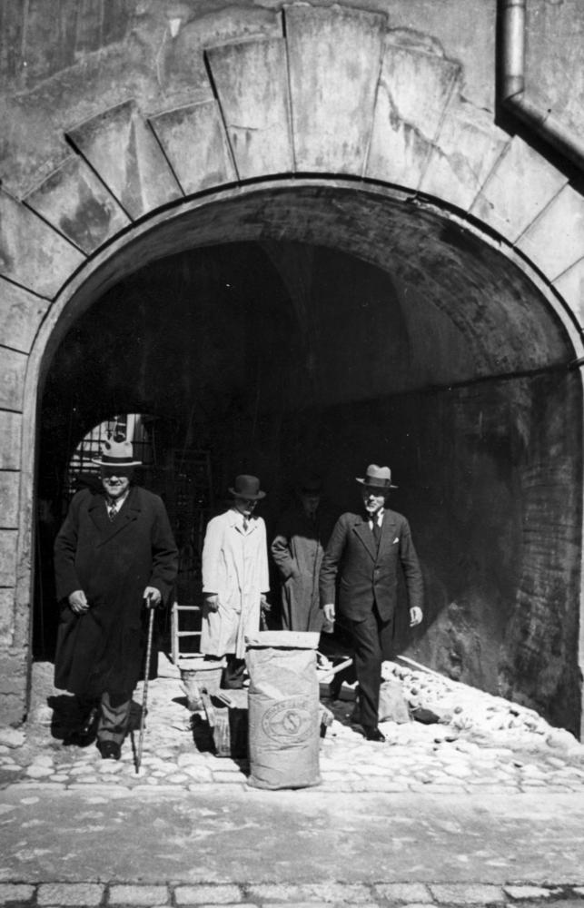 Latvijas Valsts un Ministru prezidents Kārlis Ulmanis iepazīstas ar Rīgas pils pārbūves darbiem. Priekšplānā no kreisās: 1. Kārlis Ulmanis, 2. Kārļa Ulmaņa sekretārs Jānis Cimmermanis (no 1939. gada Rudums), 3. Valsts prezidenta sekretārs (1922-1940) un Rīgas pils pārbūves komisijas loceklis Jānis Grandaus.