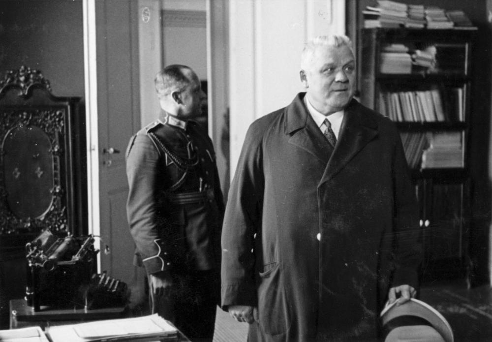 Latvijas Valsts un Ministru prezidents Kārlis Ulmanis apskata Rīgas pils telpas pēc remontdarbu veikšanas. No kreisās: Valsts prezidenta adjutants pulkvežleitnants Miervaldis Lūkins, 2. Kārlis Ulmanis.