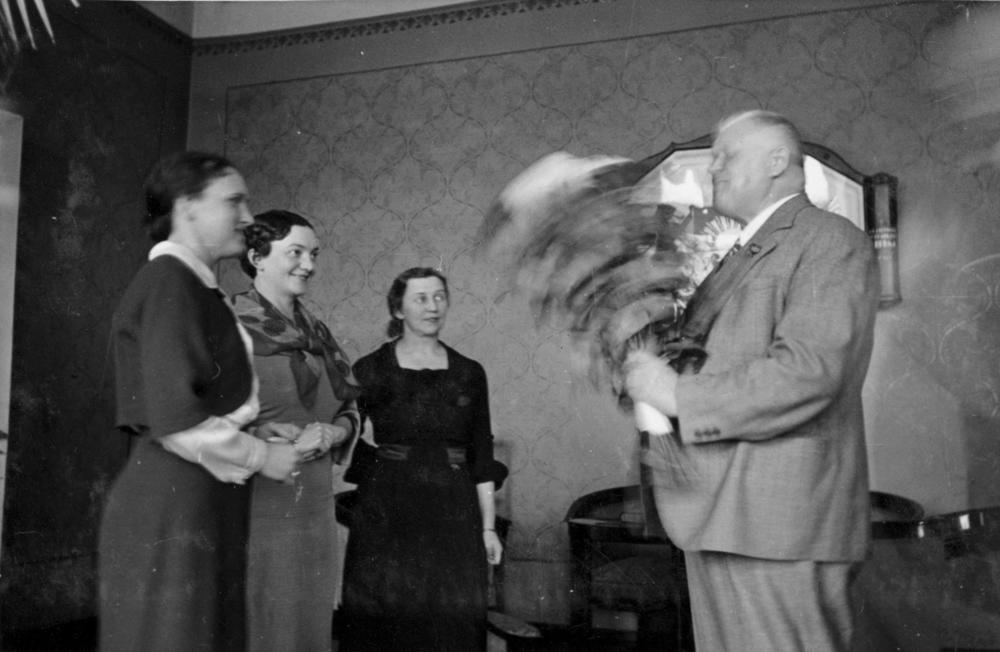 Latvijas Valsts un Ministru prezidenta Kārļa Ulmaņa (no labās) sagaidīšana Rīgas pilī pēc remontdarbu pabeigšanas.