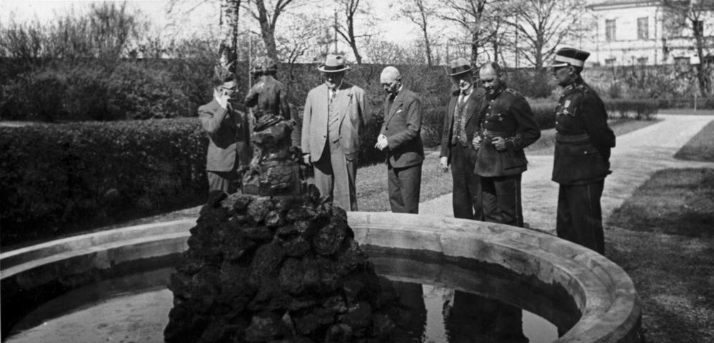 Latvijas Valsts un Ministru prezidents Kārlis Ulmanis apskata Rīgas pils dārzu pēc labiekārtošanas darbu veikšanas. Pie pils strūklakas baseina no kreisās: 2. Kārlis Ulmanis, 3. Valsts prezidenta sekretārs (1922-1940) un Rīgas pils pārbūves komisijas loceklis Jānis Grandaus, 5. Valsts prezidenta adjutants pulkvežleitnants Miervaldis Lūkins, 6. Rīgas pils komandants (1936-1940), pulkvedis, dzejnieks (pseidonīmi Rūdis, Raimonds) Raimonds Bebris.