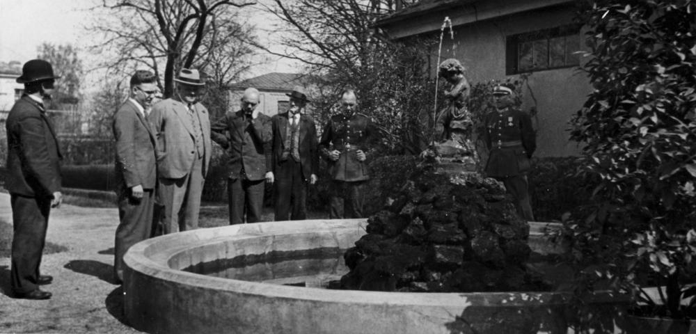 Latvijas Valsts un Ministru prezidents Kārlis Ulmanis apskata Rīgas pils dārzu pēc labiekārtošanas darbu veikšanas. Pie pils strūklakas baseina no kreisās: 2. Kārļa Ulmaņa sekretārs Jānis Cimmermanis (no 1939. gada Rudums), 3. Kārlis Ulmanis, 4. Valsts prezidenta sekretārs (1922-1940) un Rīgas pils pārbūves komisijas loceklis Jānis Grandaus, 6. Valsts prezidenta adjutants pulkvežleitnants Miervaldis Lūkins, 7. Rīgas pils komandants (1936-1940), pulkvedis, dzejnieks (pseidonīmi Rūdis, Raimonds) Raimonds Bebris.