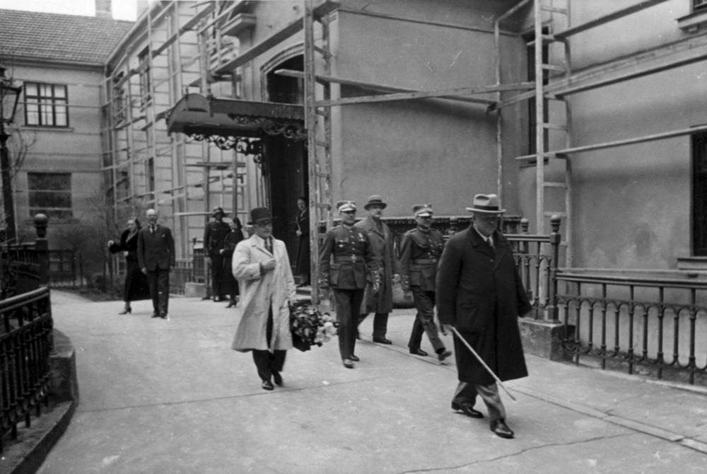 Latvijas Valsts un Ministru prezidents Kārlis Ulmanis apskata Rīgas pils dārzu pēc labiekārtošanas darbu veikšanas. Priekšplānā Kārlis Ulmanis. No 2. rindā no kreisās: 1. Kārļa Ulmaņa sekretārs Jānis Cimmermanis (no 1939. gada Rudums), 2. Valsts prezidenta adjutants pulkvežleitnants Miervaldis Lūkins, 3. Rīgas pils komandants (1936-1940), pulkvedis, dzejnieks (pseidonīmi Rūdis, Raimonds) Raimonds Bebris. Fonā no kreisās 2. Valsts prezidenta sekretārs (1922-1940) un Rīgas pils pārbūves komisijas loceklis Jānis Grandaus.