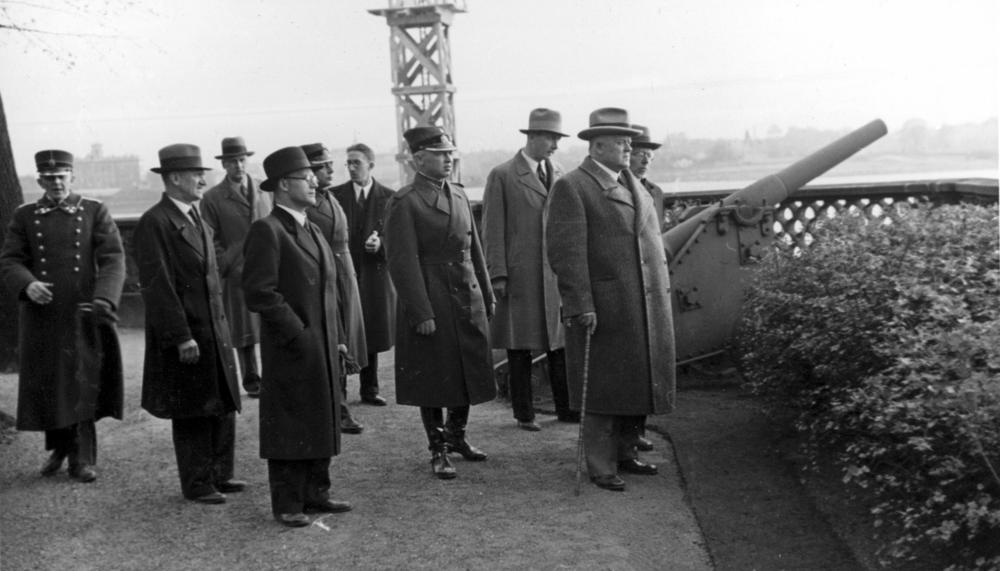 Latvijas Valsts un Ministru prezidents Kārlis Ulmanis apskata Rīgas pils dārzu pēc labiekārtošanas darbu veikšanas. 1. rindā no kreisās: 1. Rīgas policijas prefekts (1936-1939) Pēteris Pommers, 4. Rīgas pilsētas komandants (1932-1940), pulkvežleitnants Valdemārs Malcenieks, 5. Kārlis Ulmanis, 6. Valsts prezidenta sekretārs (1922-1940) un Rīgas pils pārbūves komisijas loceklis Jānis Grandaus. Fonā pils aizsardzībai paredzētais lielgabals.