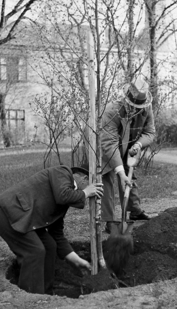 Latvijas Valsts un Ministru prezidents Kārlis Ulmanis stāda bērzus Rīgas pils dārzā. No kreisās: 1. Valsts prezidenta sekretārs (1922-1940) un Rīgas pils pārbūves komisijas loceklis Jānis Grandaus, 2. Kārlis Ulmanis.