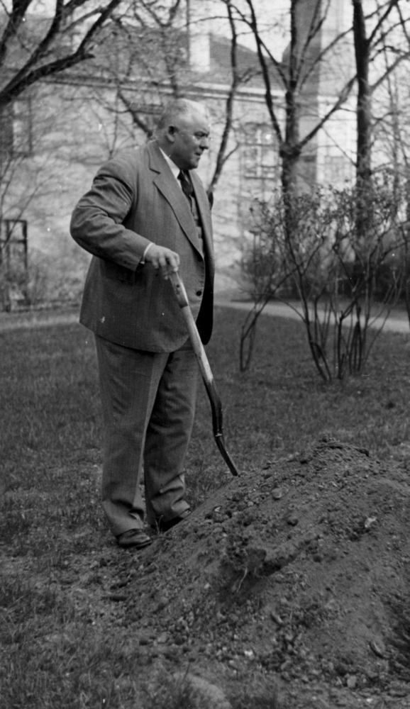 Latvijas Valsts un Ministru prezidents Kārlis Ulmanis stāda bērzus Rīgas pils dārzā.