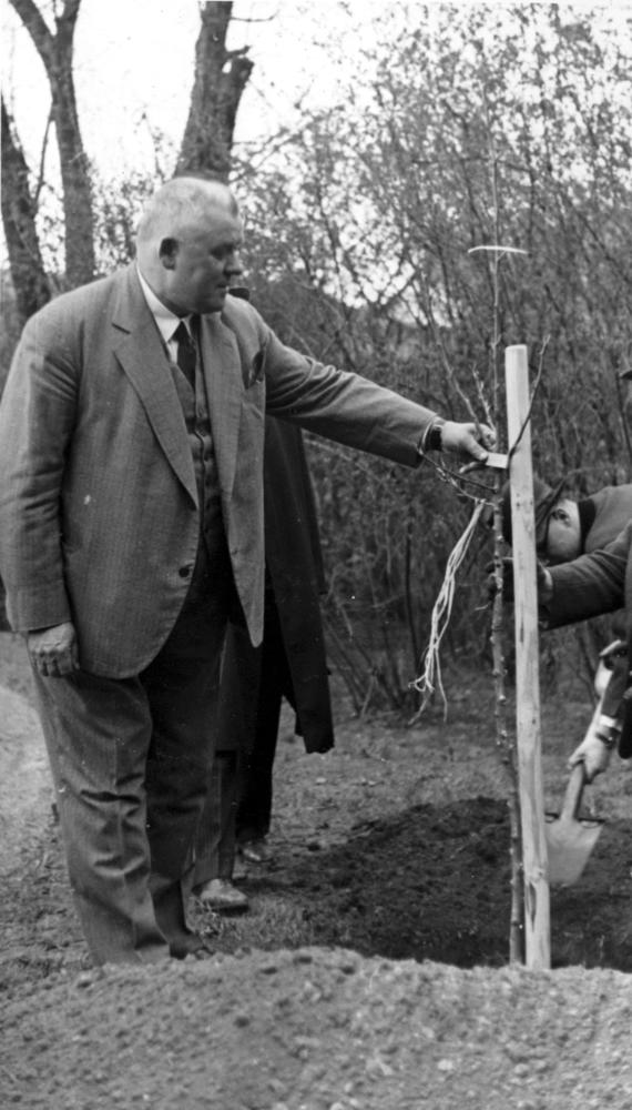 Latvijas Valsts un Ministru prezidents Kārlis Ulmanis (priekšplānā no kreisās) stāda bērzus Rīgas pils dārzā.