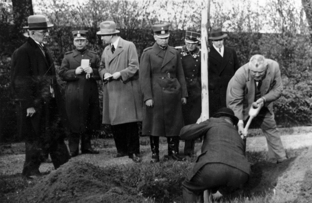Latvijas Valsts un Ministru prezidents Kārlis Ulmanis stāda kokus Rīgas pils dārzā. No kreisās: 1. Valsts prezidenta sekretārs (1922-1940) un Rīgas pils pārbūves komisijas loceklis Jānis Grandaus, 2. Rīgas pils komandants (1936-1940), pulkvedis, dzejnieks (pseidonīmi Rūdis, Raimonds) Raimonds Bebris, 4. Rīgas pilsētas komandants (1932-1940), pulkvežleitnants Valdemārs Malceniek, 5. Rīgas policijas prefekts (1936-1939) Pēteris Pommers, 6. Latvijas Iekšlietu ministrijas drošības policijas departamenta direktors Jānis Fridrihsons, 7. Kārlis Ulmanis.