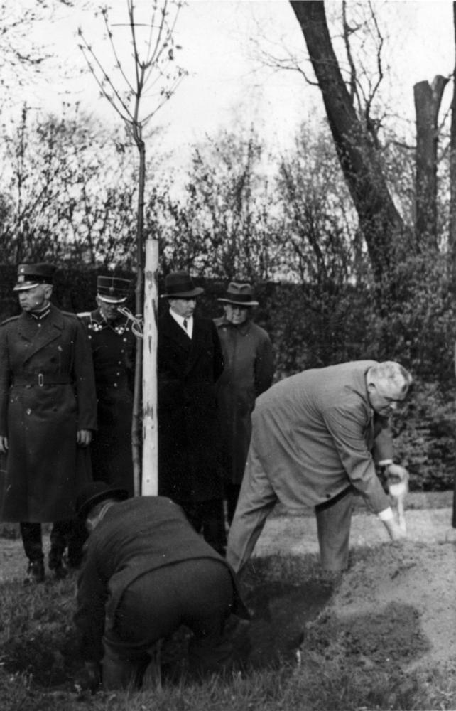Latvijas Valsts un Ministru prezidents Kārlis Ulmanis stāda kokus Rīgas pils dārzā. Priekšplānā no labās Kārlis Ulmanis. No kreisās: 1. Rīgas pilsētas komandants (1932-1940), pulkvežleitnants Valdemārs Malcenieks, 2. Rīgas policijas prefekts Pēteris Pommers, 3. Zemkopības ministrijas zemkopības departamenta zvejniecības un zivkopības nodaļas vadītājs (žurnāla "Zvejniecības mēnešraksts" redaktors) Voldemārs Miezis, 4. Latvijas Iekšlietu ministrijas drošības policijas departamenta direktors Jānis Fridrihsons (Jānis Frīdrihs Valentīns Fridrihsons (no 1939. gada Jānis Skrauja).