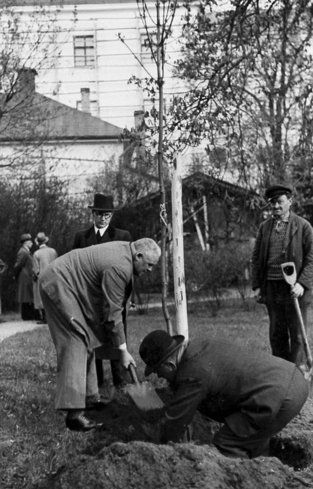 Latvijas Valsts un Ministru prezidents Kārlis Ulmanis stāda kļavu Rīgas pils dārzā. Priekšplānā no kreisās Kārlis Ulmanis. Fonā no kreisās: 1. Kārļa Ulmaņa sekretārs Jānis Cimmermanis (no 1939. gada Rudums), 2. pils dārznieks Zoltners.