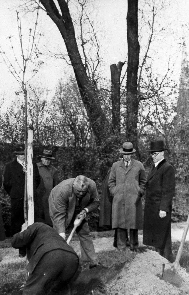 Latvijas Valsts un Ministru prezidents Kārlis Ulmanis (centrā) stāda kokus Rīgas pils dārzā. Fonā no kreisās: 1. Zemkopības ministrijas zemkopības departamenta zvejniecības un zivkopības nodaļas vadītājs (žurnāla "Zvejniecības mēnešraksts" redaktors) Voldemārs Miezis, 2. Latvijas Iekšlietu ministrijas drošības policijas departamenta direktors Jānis Fridrihsons (Jānis Frīdrihs Valentīns Fridrihsons (no 1939. gada Jānis Skrauja), 4. Kārļa Ulmaņa sekretārs Jānis Cimmermanis (no 1939. gada Rudums).