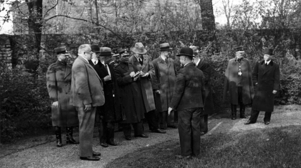 Latvijas Valsts un Ministru prezidents Kārlis Ulmanis stāda kokus Rīgas pils dārzā. 1. rindā no kreisās: 1. Kārlis Ulmanis, 2. Valsts prezidenta sekretārs (1922-1940) un Rīgas pils pārbūves komisijas loceklis Jānis Grandaus, 3. Valsts prezidenta adjutants pulkvežleitnants Miervaldis Lūkins, 5. Latvijas Iekšlietu ministrijas drošības policijas departamenta direktors Jānis Fridrihsons (Jānis Frīdrihs Valentīns Fridrihsons (no 1939. gada Jānis Skrauja) (?), 9. Kārļa Ulmaņa sekretārs Jānis Cimmermanis (no 1939. gada Rudums). 2. rindā no kreisās: 1. Rīgas pilsētas komandants (1932-1940), pulkvežleitnants Valdemārs Malcenieks, 2. Zemkopības ministrijas zemkopības departamenta zvejniecības un zivkopības nodaļas vadītājs (žurnāla "Zvejniecības mēnešraksts" redaktors) Voldemārs Miezis, 3. Rīgas policijas prefekts Pēteris Pommers.