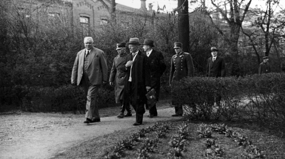 Latvijas Valsts un Ministru prezidents Kārlis Ulmanis pastaigājas pa Rīgas pils dārzu, kur iestādīja 3 kokus - Rīgas apkārtnē augušu bērzu, Vidzemes sviesta bumbieri, kas audzēta Priekuļu lauksaimniecības vidusskolas stādu audzētavā un tumši sarkanu kļavu, kura audzēta Rīgas pilsētas dārzsaimniecībā. 1. rindā no kreisās: 1. Latvijas Valsts un Ministru prezidents Kārlis Ulmanis, 2. Valsts prezidenta sekretārs (1922-1940) un Rīgas pils pārbūves komisijas loceklis Jānis Grandaus. 2. rindā no kreisās: 1. Rīgas pilsētas komandants Valdemārs Malcenieks, 2. Zemkopības ministrijas zemkopības departamenta zvejniecības un zivkopības nodaļas vadītājs (žurnāla "Zvejniecības mēnešraksts" redaktors) Voldemārs Miezis, 3. Rīgas pilsētas prefekts Pēteris Pommers.