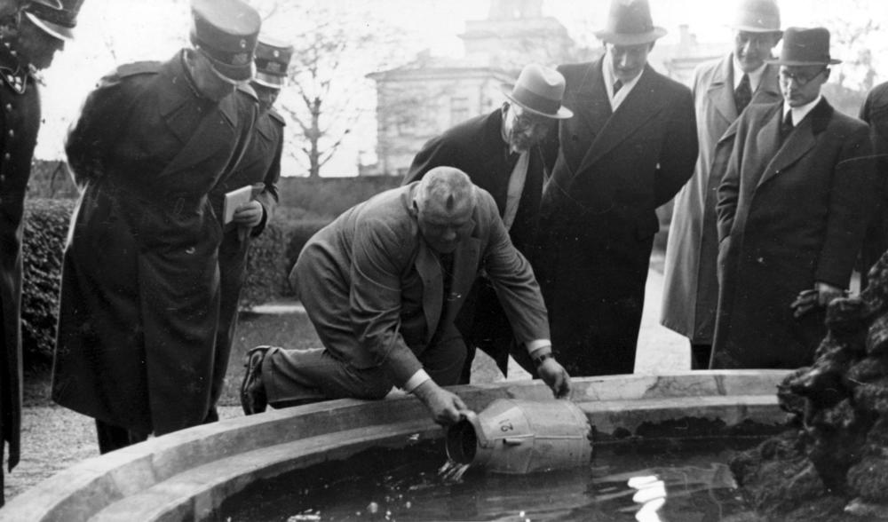 Latvijas Valsts un Ministru prezidents Kārlis Ulmanis iepazīstas ar Rīgas pils labiekārtošanas darbiem. Amatpersonas piedalās zivju ielaišanā pils baseinā. Centrā no kreisās: 1. Rīgas pilsētas komandants (1932-1940), pulkvežleitnants Valdemārs Malcenieks, 2. Kārlis Ulmanis, 3. Valsts prezidenta sekretārs (1922-1940) un Rīgas pils pārbūves komisijas loceklis Jānis Grandaus, 4. Zemkopības ministrijas zemkopības departamenta zvejniecības un zivkopības nodaļas vadītājs (žurnāla "Zvejniecības mēnešraksts" redaktors) Voldemārs Miezis, 5. Latvijas Iekšlietu ministrijas drošības policijas departamenta direktors Jānis Fridrihsons, 6. Kārļa Ulmaņa sekretārs Jānis Cimmermanis (no 1939. gada Rudums).