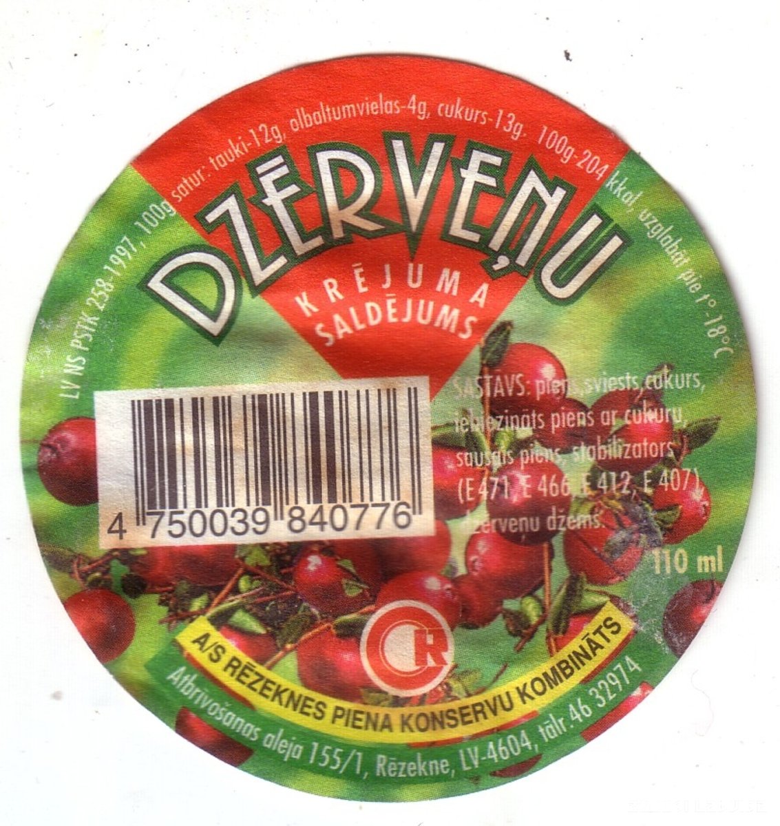 Etiķete A/S "Rēzeknes piena konservu kombināta" dzērveņu krējuma saldējumam. LV NS PSTK 258 – 1997. Saldējuma daudzums 110 mililitri