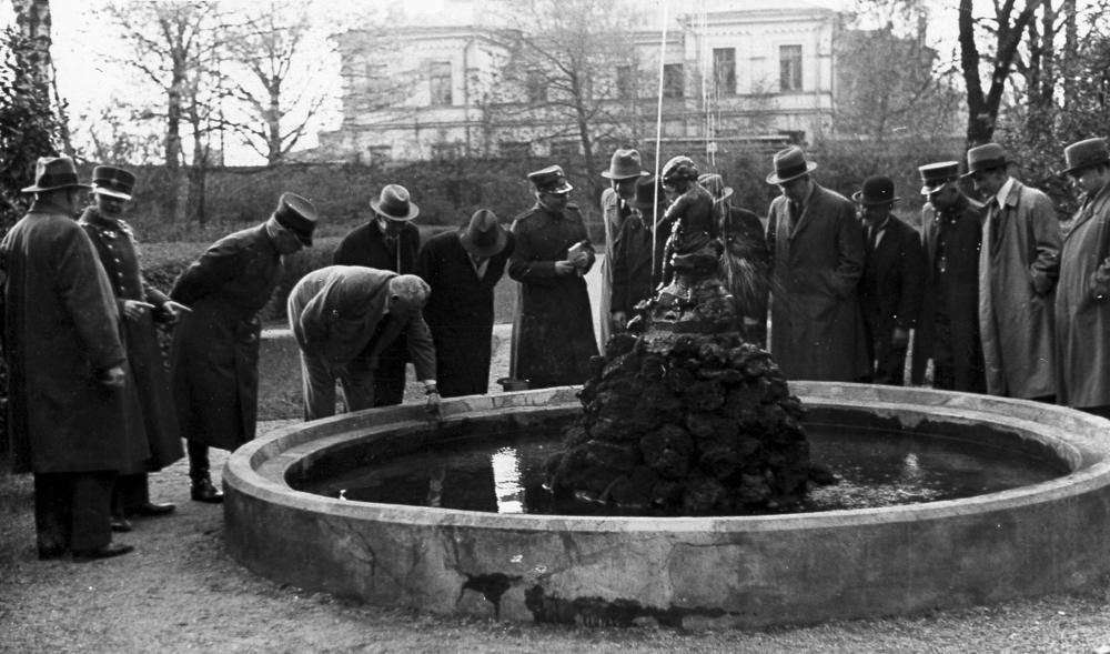 Latvijas Valsts un Ministru prezidents Kārlis Ulmanis iepazīstas ar Rīgas pils labiekārtošanas darbiem. Amatpersonas piedalās zivju ielaišana pils strūklakas baseinā. No kreisās: 2. Rīgas pilsētas prefekts Pēteris Pommers, 3. Rīgas pilsētas komandants Valdemārs Malcenieks, 4. Kārlis Ulmanis, 5. Valsts prezidenta sekretārs (1922-1940) un Rīgas pils pārbūves komisijas loceklis Jānis Grandaus, 6. Zemkopības ministrijas zemkopības departamenta zvejniecības un zivkopības nodaļas vadītājs (žurnāla "Zvejniecības mēnešraksts" redaktors) Voldemārs Miezis, 7. Valsts prezidenta adjutants pulkvežleitnants Miervaldis Lūkins, 8. Kārļa Ulmaņa sekretārs Jānis Cimmermanis (no 1939. gada Rudums), 10. Latvijas Iekšlietu ministrijas drošības policijas departamenta direktors Jānis Fridrihsons (Jānis Frīdrihs Valentīns Fridrihsons (no 1939. gada Jānis Skrauja).