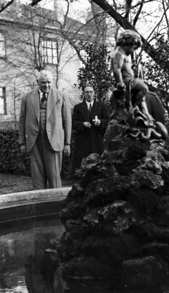 Latvijas Valsts un Ministru prezidents Kārlis Ulmanis iepazīstas ar Rīgas pils labiekārtošanas darbiem. No kreisās pie pils strūklakas zivju baseina Kārlis Ulmanis.
