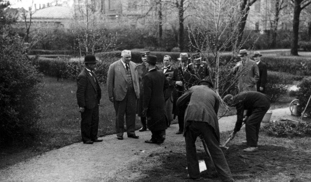 Latvijas Valsts un Ministru prezidents Kārlis Ulmanis pastaigājas pa Rīgas pils dārzu, kur vēro Rīgas labiekārtošanas darbus, tai skaitā koku stādīšanu. 1. rindā no kreisās: 1. Valsts prezidenta sekretārs (1922-1940) un Rīgas pils pārbūves komisijas loceklis Jānis Grandaus, 2. Kārlis Ulmanis, 3. Kārļa Ulmaņa sekretārs Jānis Cimmermanis (no 1939. gada Rudums). 2. rindā no kreisās: 1. Rīgas pilsētas komandants Valdemārs Malcenieks, 2. Rīgas pilsētas prefekts Pēteris Pommers. Fonā no kreisās: 1. Latvijas Iekšlietu ministrijas drošības policijas departamenta direktors Jānis Fridrihsons (Jānis Frīdrihs Valentīns Fridrihsons (no 1939. gada Jānis Skrauja), 2. Zemkopības ministrijas zemkopības departamenta zvejniecības un zivkopības nodaļas vadītājs (žurnāla "Zvejniecības mēnešraksts" redaktors) Voldemārs Miezis.