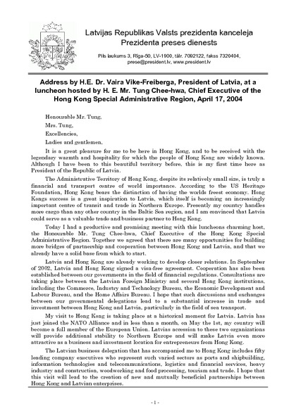 Address by H.E. Dr. Vaira Vike-Freiberga, President of Latvia, at a luncheon hosted by H. E. Mr. Tung Chee-hwa, Chief Executive of the Hong Kong Special Administrative Region, April 17, 2004