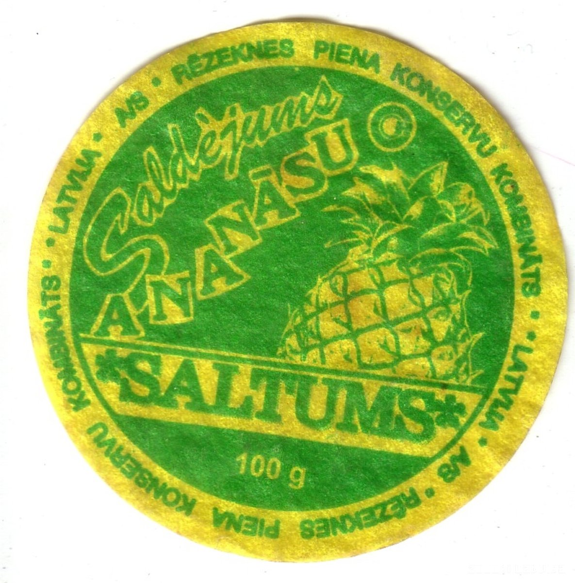 Etiķete A/S "Rēzeknes piena konservu kombināta" ananāsu saldējumam "Saltums". Saldējuma daudzums 100 grami