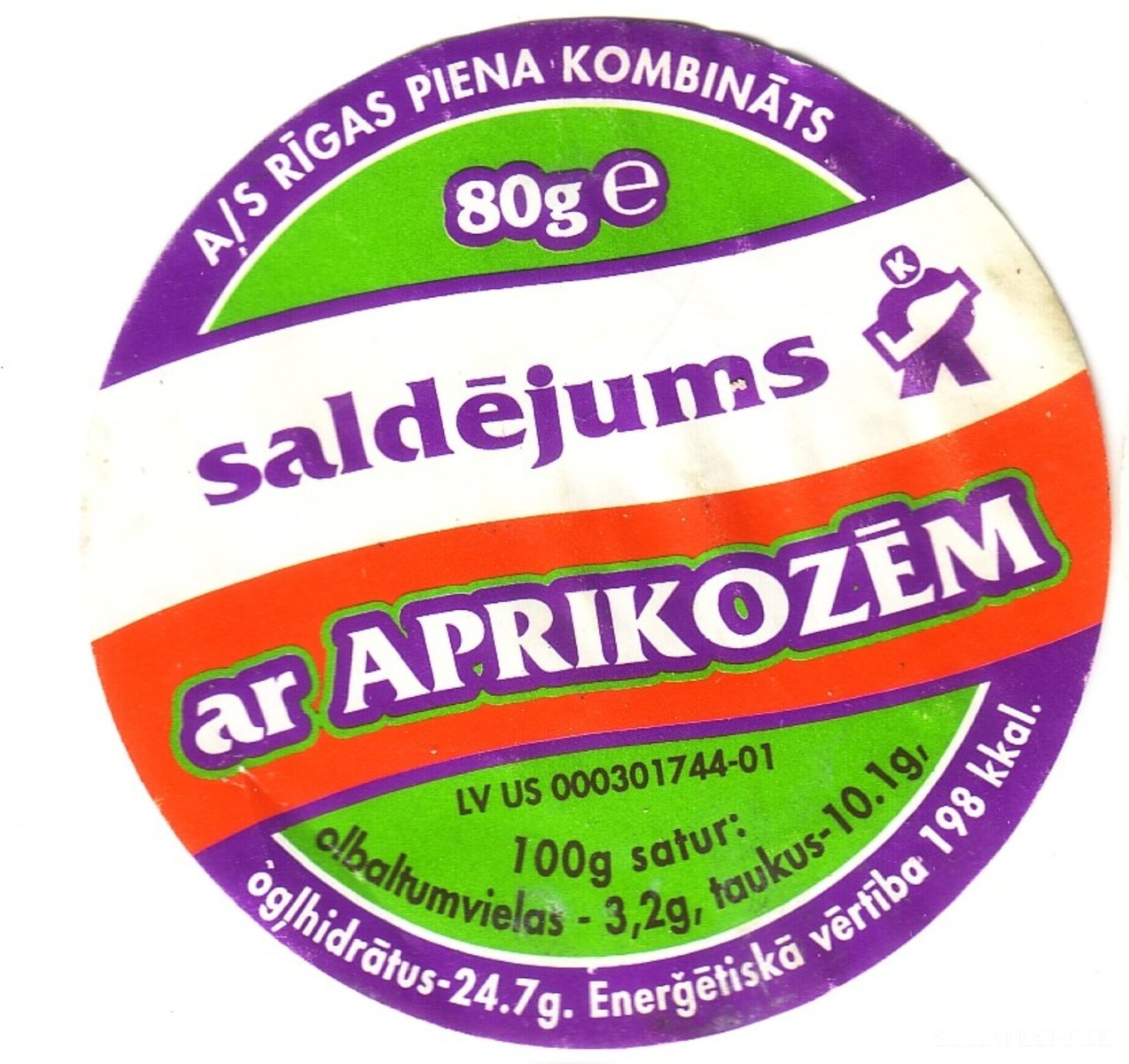 Etiķete A/S "Rīgas piena kombināta” saldējumam ar aprikozēm. LV US 000301744-01. Saldējuma daudzums 80 grami