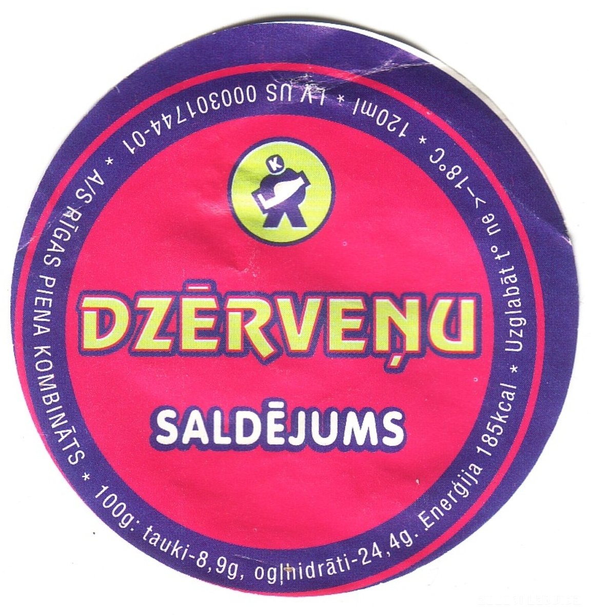 Etiķete A/S "Rīgas piena kombināta” dzērveņu saldējumam. LV US 000301744-01. Daudzums 120 mililitri