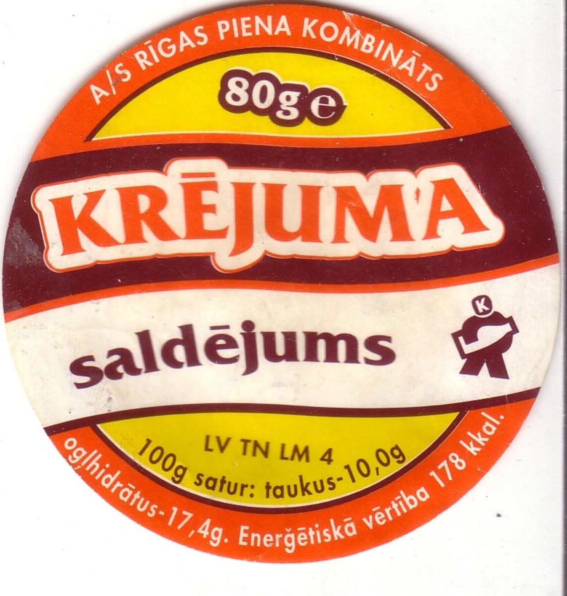 Etiķete A/S "Rīgas piena kombināta” krējuma saldējumam. LV TN LM 4. Saldējuma daudzums 80 grami