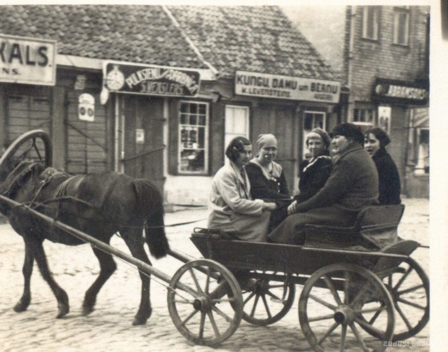 Zirgu pajūgs. Neatpazītas personas. Privāto veikalu ēkas. Veikalu uzraksti, nosaukumi, izkārtnes. Bruģis