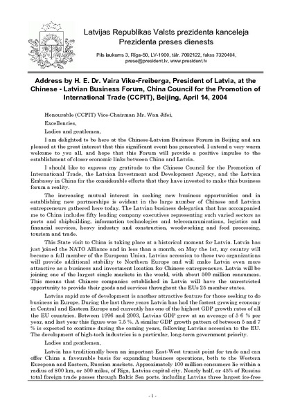 Address by H. E. Dr. Vaira Vike-Freiberga, President of Latvia, at the Chinese - Latvian Business Forum, China Council for the Promotion of International Trade (CCPIT), Beijing, April 14, 2004