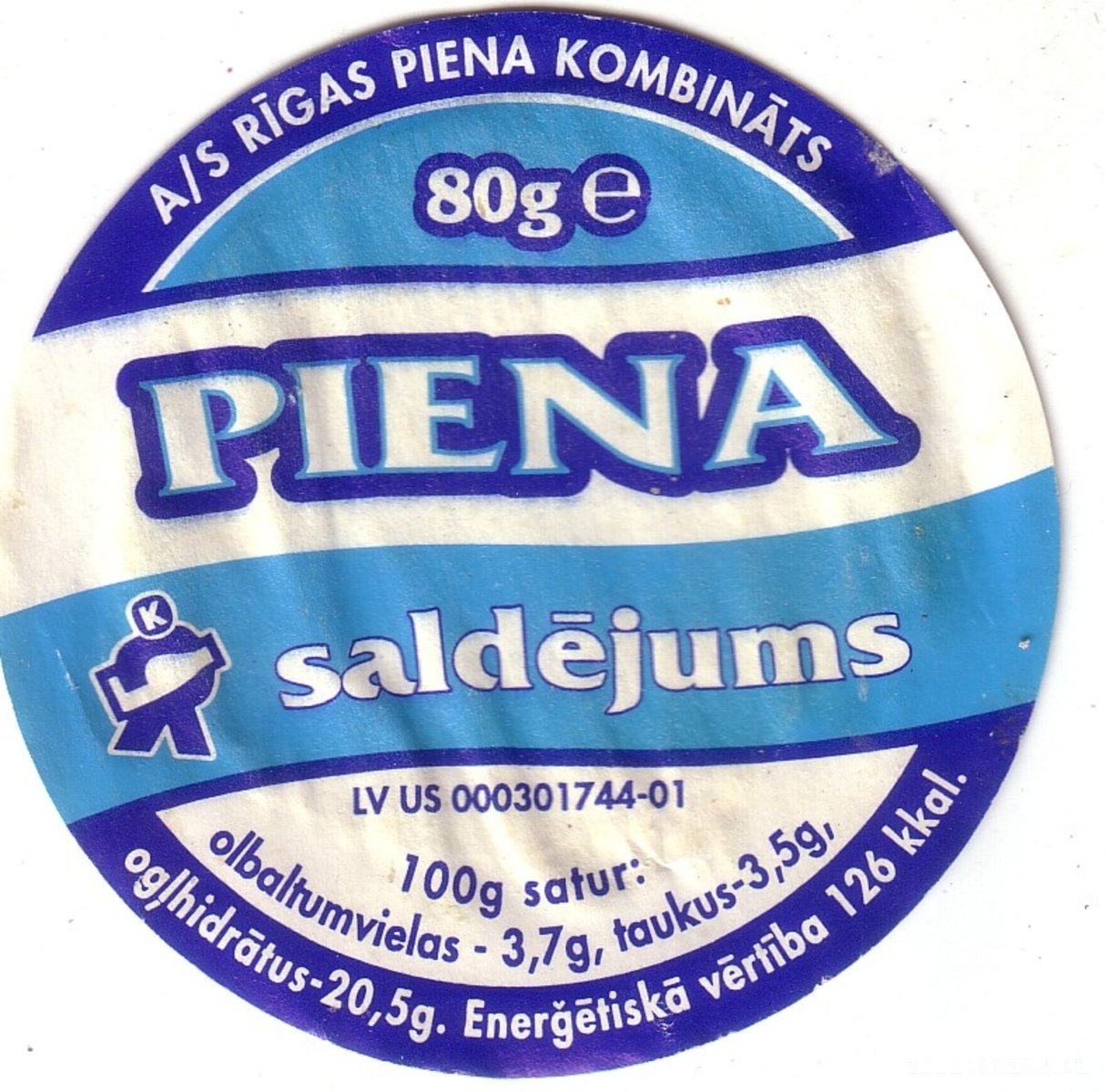 Etiķete A/S „Rīgas piena kombināta” piena saldējumam. LV US 000301744-01. Daudzums 80 grami