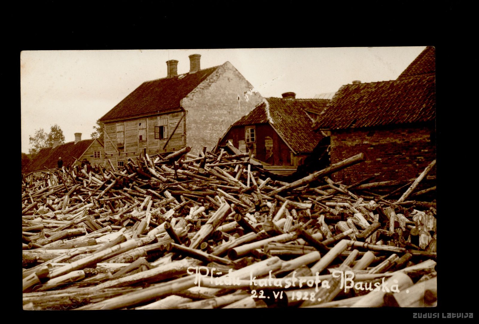 Plūdi Bauskā 1928. gada 22. jūnijā. Sadrūzmējušies baļķi rada draudus Rīgas ielas apbūvei