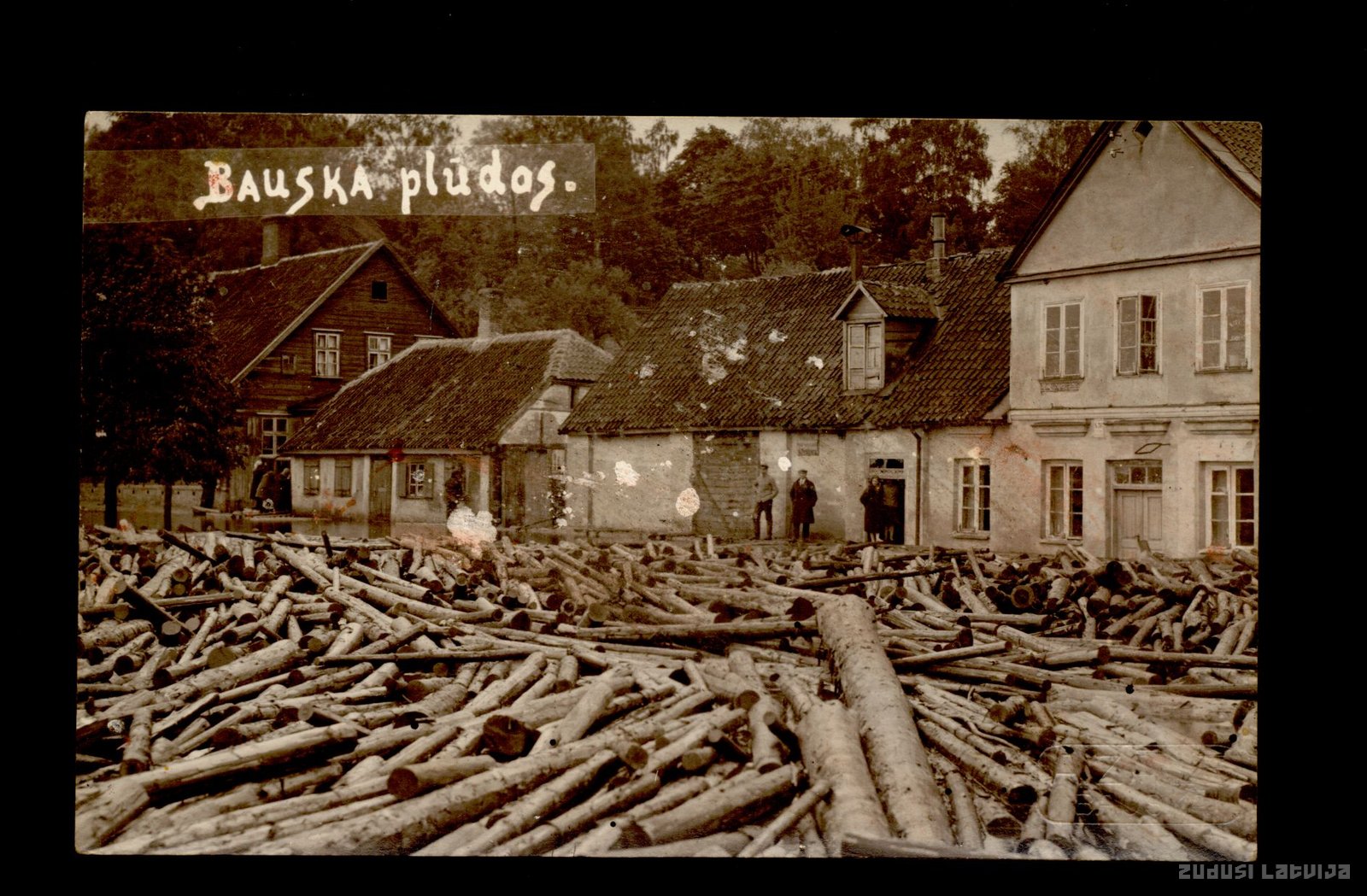 Plūdi Bauskā 1928. gada 22. jūnijā. Baļķi posta Rīgas ielu iepretim vietai, kur atradās baļķu aiznestais Plosta tilts. Baļķu sastrēgums pacēlies pakalnā līdz sasniedzis Rīgas ielas mājas, kuras atrodas pakalnā patālu no upes