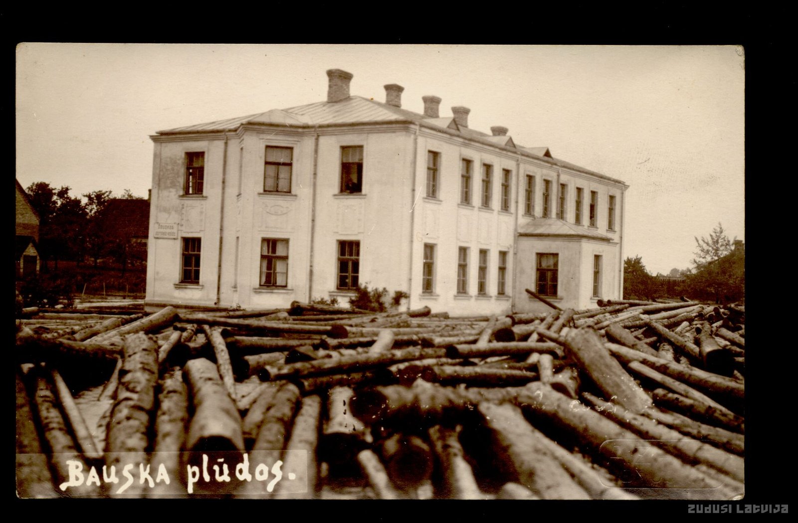 Plūdi Bauskā 1928. gada 22. jūnijā. Sastrēgums Mēmeles labajā krastā, pie Bauskas apriņķa valdes ēkas, kur tagad atrodas Pārtikas un Veterinārais dienests. Mēmeles labais krasts ir augstāks kā kreisais, bet baļķi izlauzušies arī tur