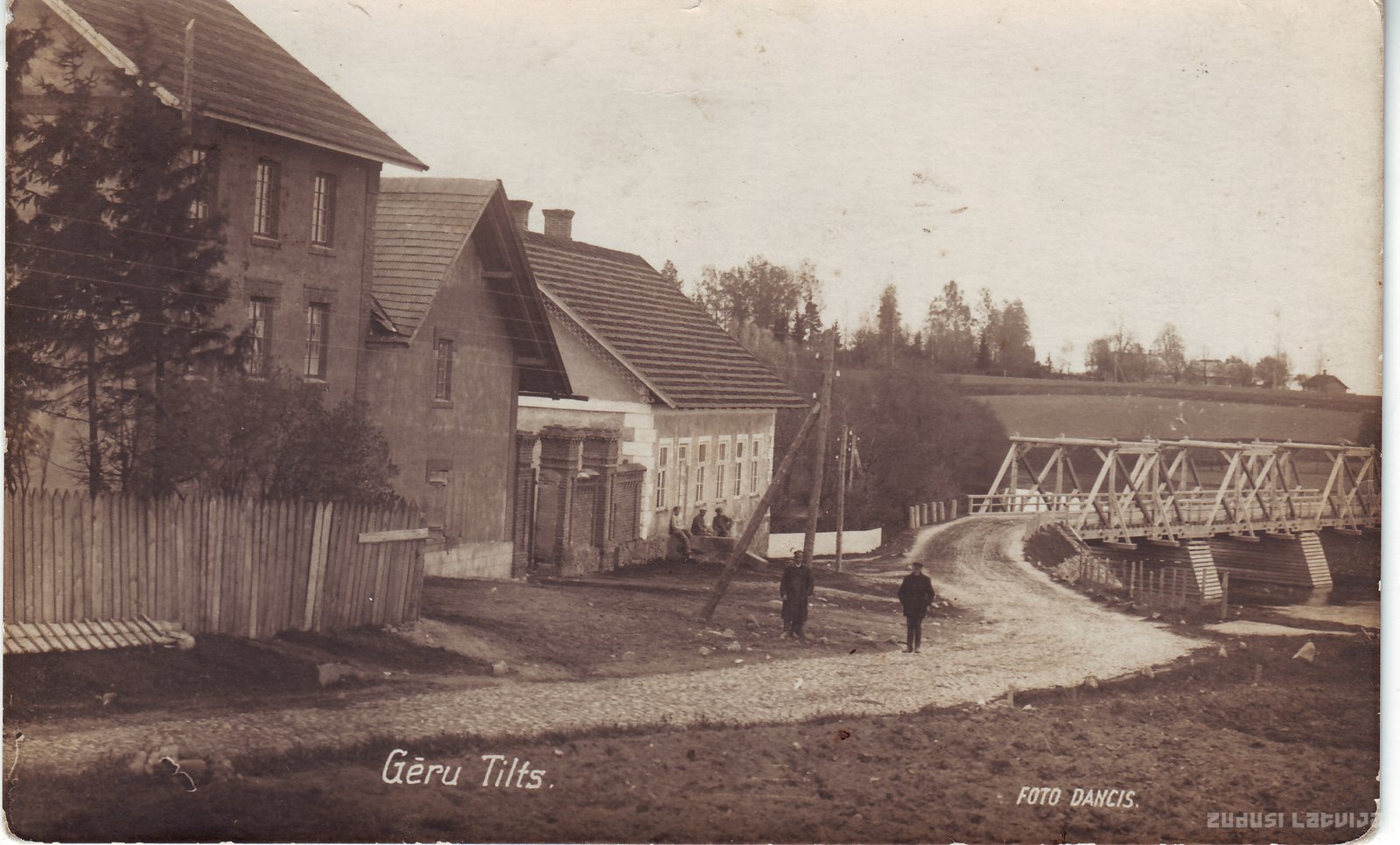 Tilts pār Rūjas upi, iebraucot Rūjienas pilsētā no Valmieras puses, 1927. gadā. Pērnavas ielas sākums. Netālu no Lauvas līča un Raibajām dzirnavām