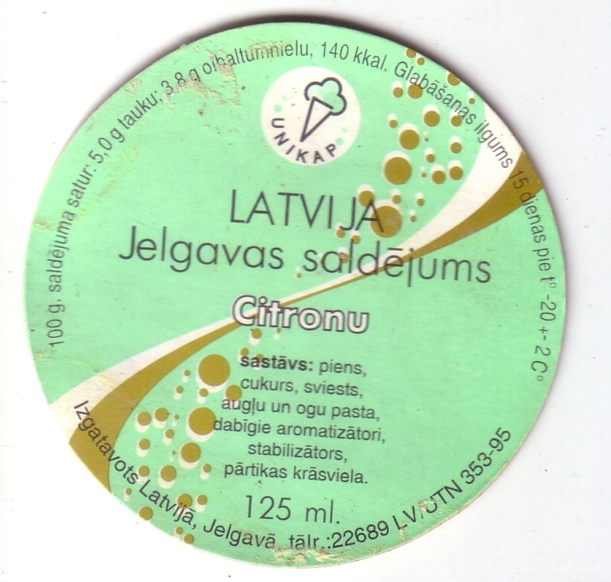 Etiķete Jelgavas citronu saldējumam. Ražotājs "UNIKAP". LV/UTN 353-95. Saldējuma daudzums 125 mililitri