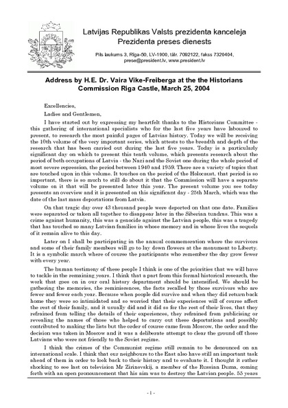 Address by H.E. Dr. Vaira Vike-Freiberga at the the Historians Commission Riga Castle, March 25, 2004