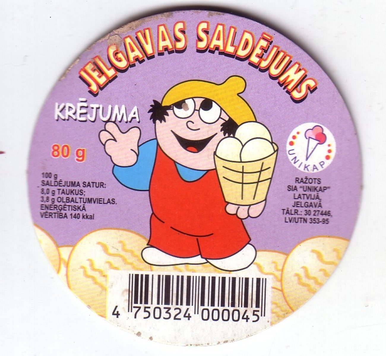 Etiķete Jelgavas krējuma saldējumam. Ražotājs "UNIKAP". LV/UTN 353-95. Saldējuma daudzums 80 grami