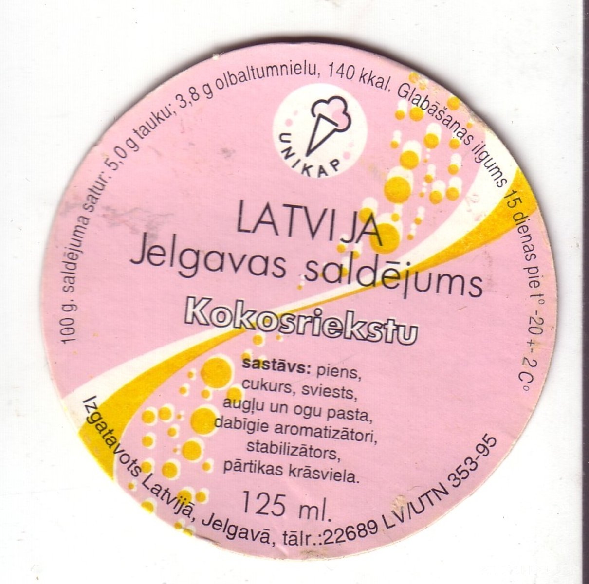 Etiķete Jelgavas kokosriekstu saldējumam. Ražotājs "UNIKAP". LV/UTN 353-95. Saldējuma daudzums 125 mililitri