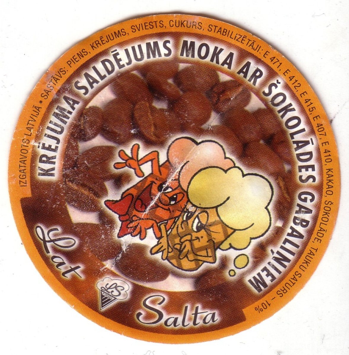 Etiķete krējuma saldējumam moka ar šokolādes gabaliņiem. Ražotājs „Lat Salta”