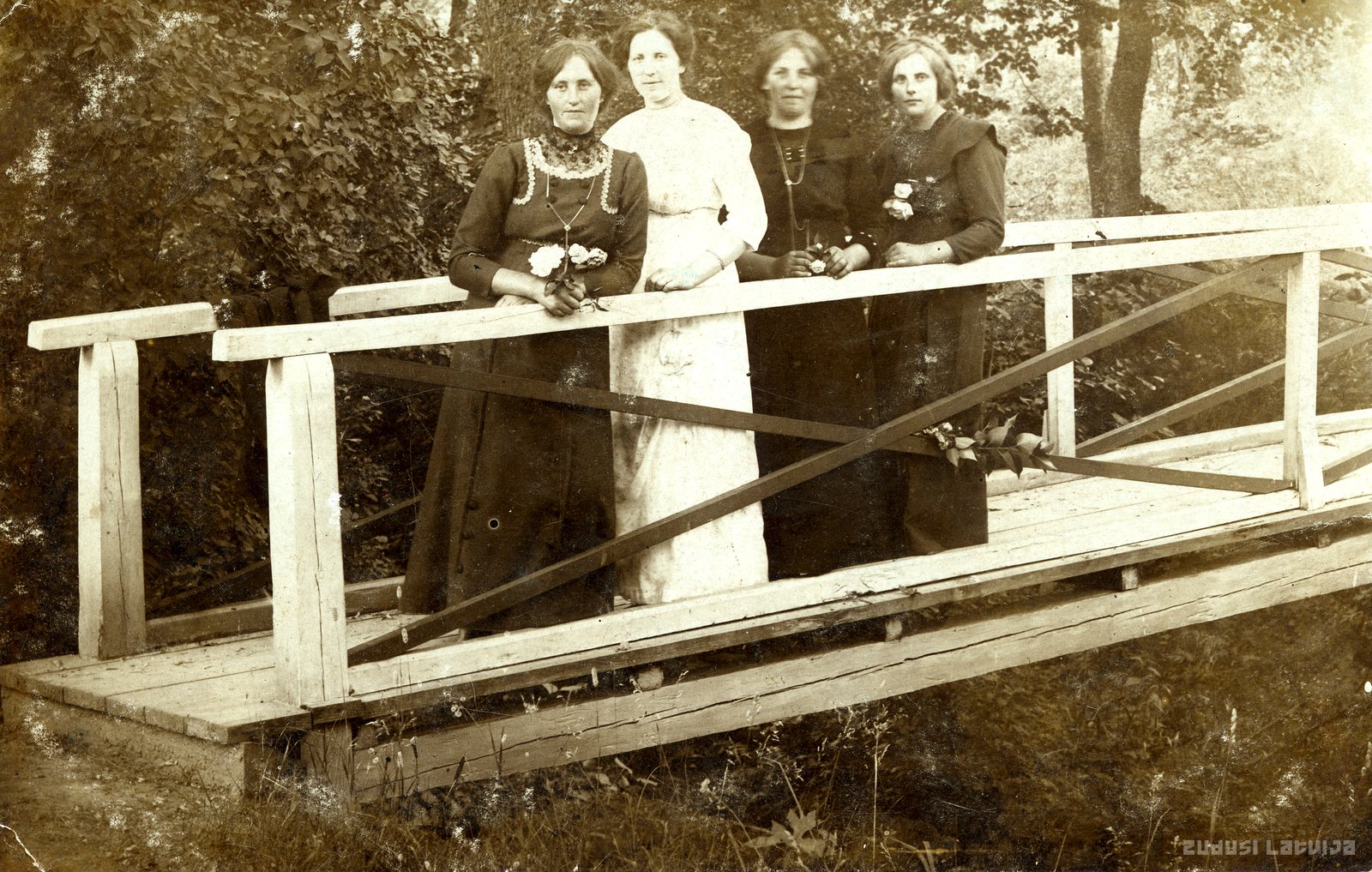 Koka tilts 1920. gados. Valmieras rajons, Matīšu pagasts, Bauņi (bijušais Bauņu pagasts). Neatpazītas sievietes