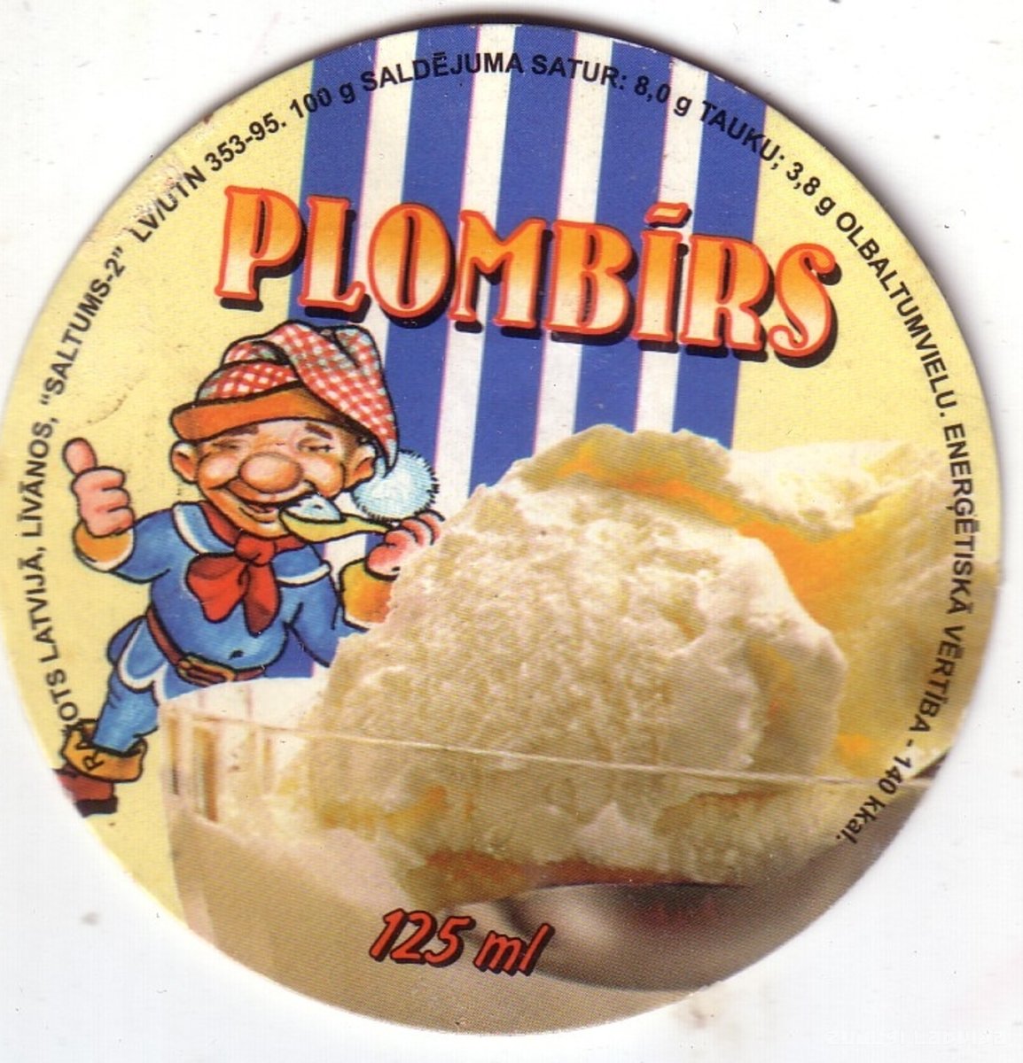 Etiķete plombīram. Ražotājs "Saltums - 2" Līvānos. LV/UTN 353-95. Saldējuma daudzums 125 mililitri
