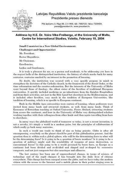 Address by H.E. Dr. Vaira Vike-Freiberga, at the University of Malta, Centre for International Studies, Valetta, February 18, 2004