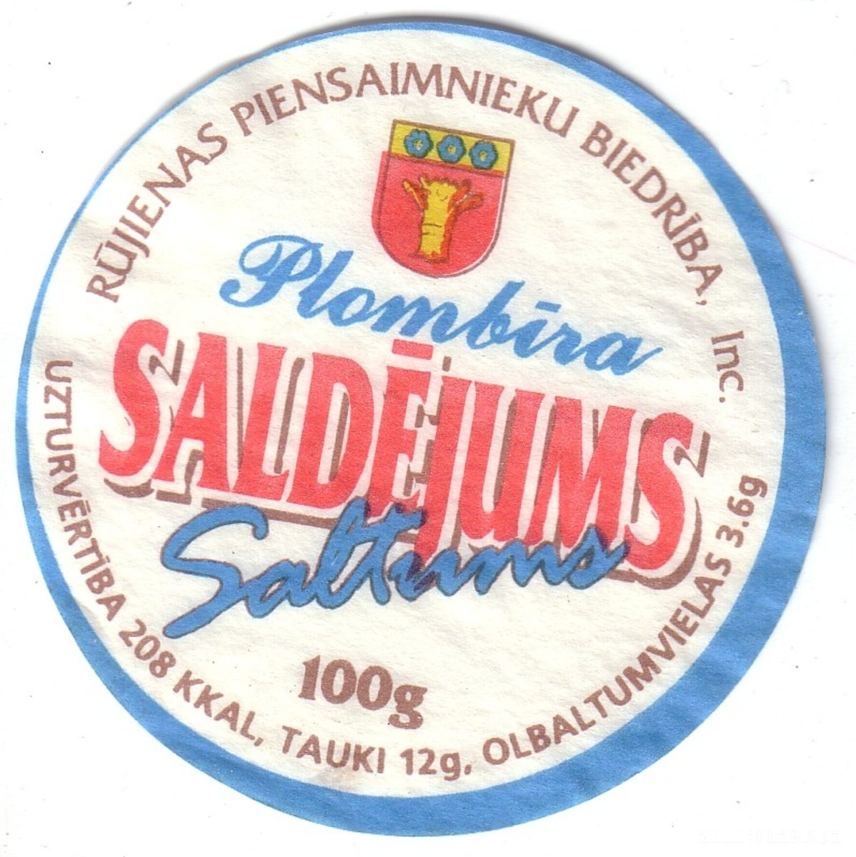 Etiķete Rūjienas piensaimnieku biedrības plombīra saldējumam saltums. Saldējuma daudzums 100 grami
