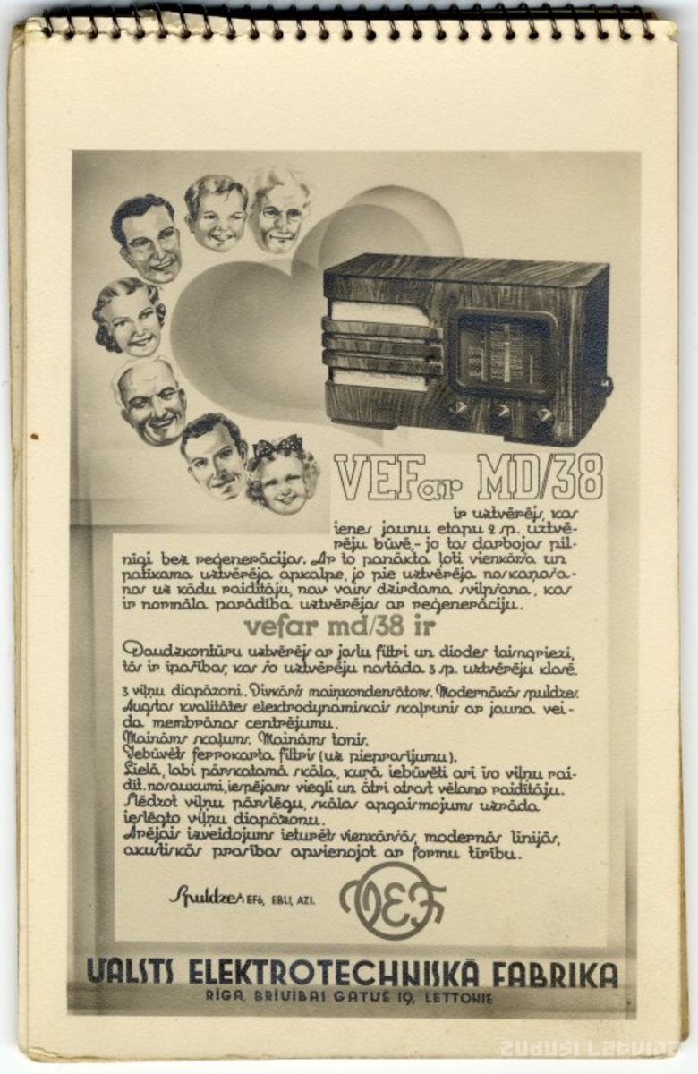Radioaparāta "Vefar MD/38" reklāma. Reklāmā tiek uzskaitītas radioaparāta labās īpašības. "Vefar MD/38" ražots Valsts Elektroniskajā fabrikā 1937./38. gadā