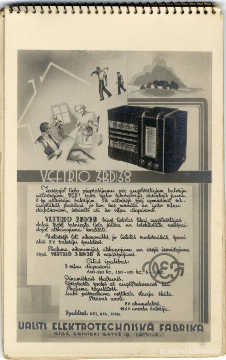 Radioaparāta "Veftrio 3BD/38" reklāma. Reklāmā tiek uzskaitītas radioaparāta labās īpašības. "Veftrio 3BD/38" ražots Valsts Elektroniskajā fabrikā 1937./38. gadā