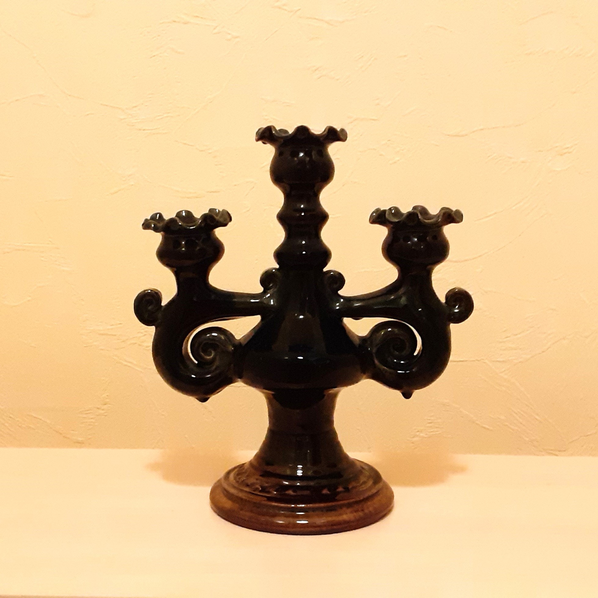 Annas Oleiņikovas stāsts: Keramiķa Aleksandra Vilcāna 2002. gadā veidotais svečturis. Uz pamatnes autora iniciāļi.