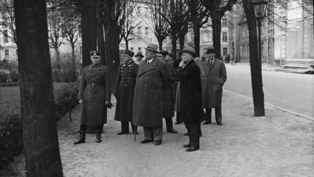 Latvijas Valsts un Ministru prezidents Kārlis Ulmanis iepazīstas ar 15. maija jeb Vienības dienas (arī Tautas vienotības diena) svinību sagatavošanas darbiem. 1. rindā no kreisās: 1. Rīgas pilsētas komandants Valdemārs Malcenieks, 2. Rīgas pilsētas prefekts Pēteris Pommers, 3. Kārlis Ulmanis, 4. Valsts prezidenta sekretārs (1922-1940) un Rīgas pils pārbūves komisijas loceklis Jānis Grandaus.
