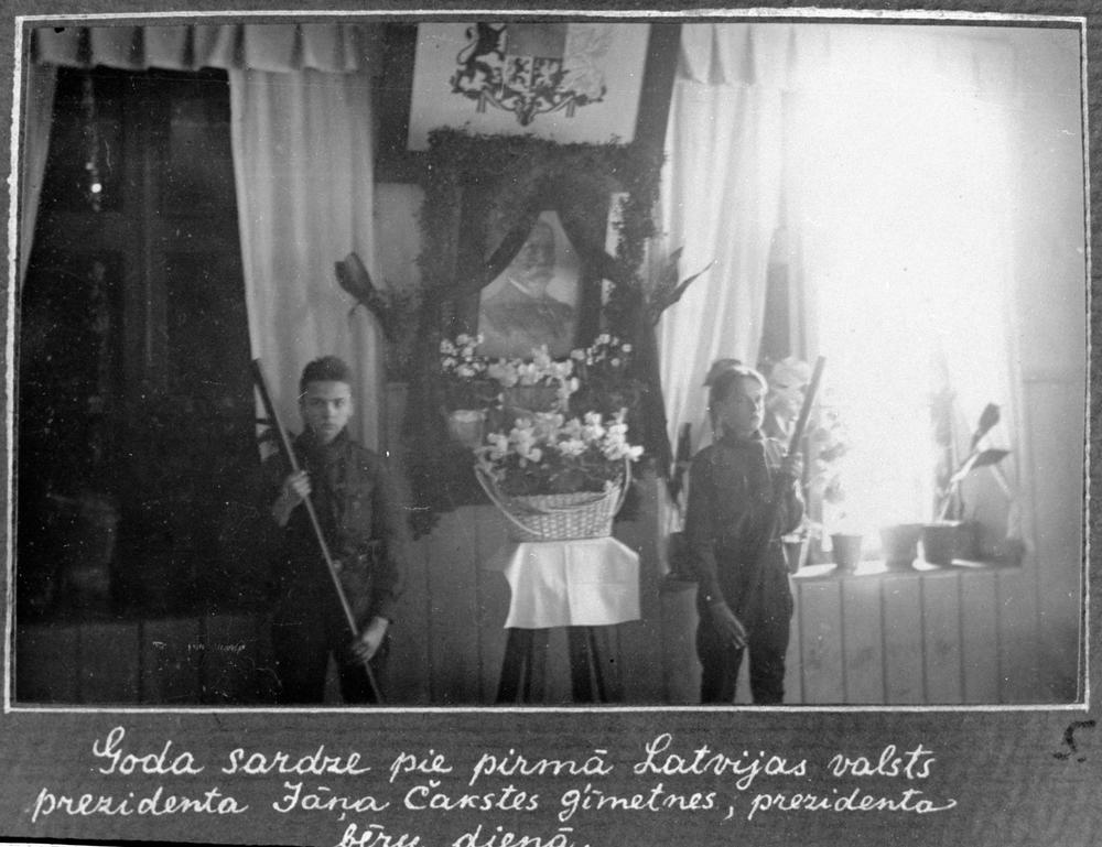 Latvijas Skautu centrālās organizācijas (LSCO) 69. Valmieras kurlmēmo skautu pulciņa skauti goda sardzē pie pirmā Latvijas Valsts prezidenta Jāņa Čakstes fotogrāfijas prezidenta bēru dienā.