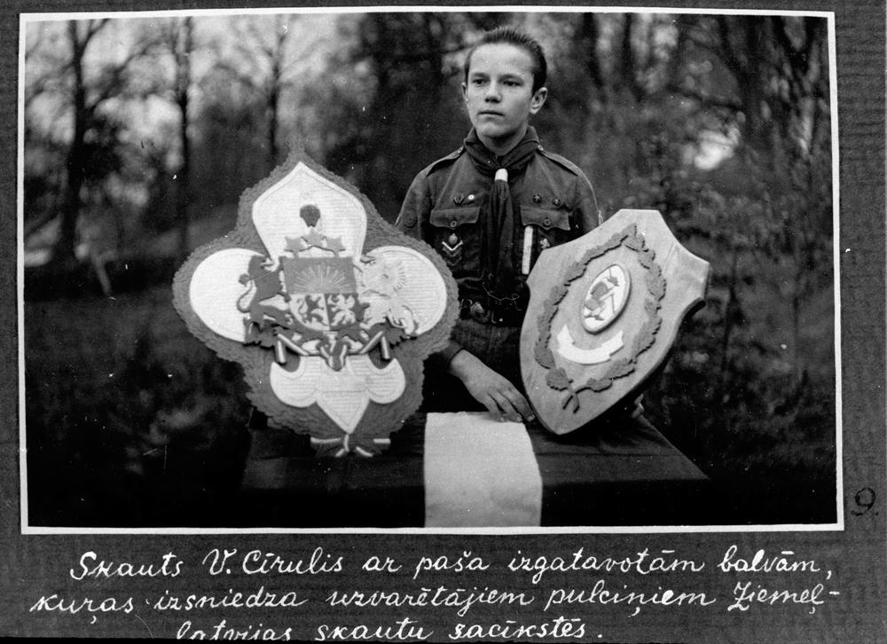Latvijas Skautu centrālās organizācijas (LSCO) 69. Valmieras kurlmēmo skautu pulciņa skauts V. Cīrulis ar paša izgatavotām balvām Ziemeļlatvijas skautu sacīkšu uzvarētājiem.