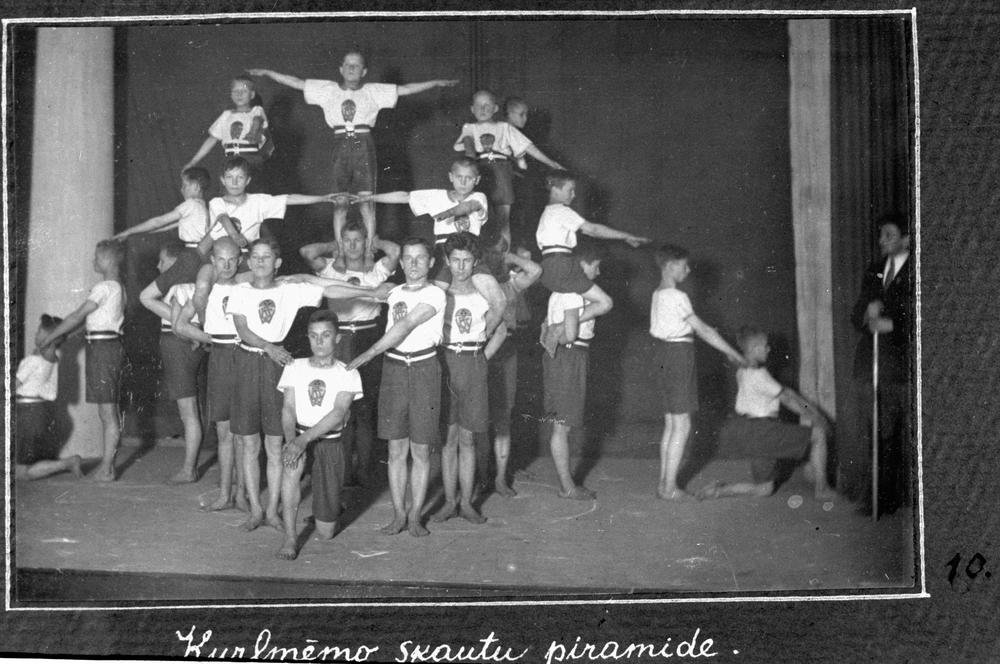 Latvijas Skautu centrālās organizācijas (LSCO) 69. Valmieras kurlmēmo skautu pulciņa dalībnieku izveidotā cilvēku piramīda.